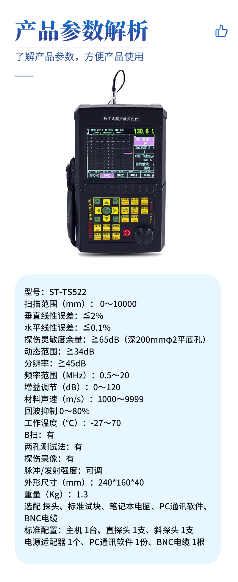 選配 | 探頭、標(biāo)準(zhǔn)試塊、筆記本電腦、PC通訊軟件、BNC電纜 |