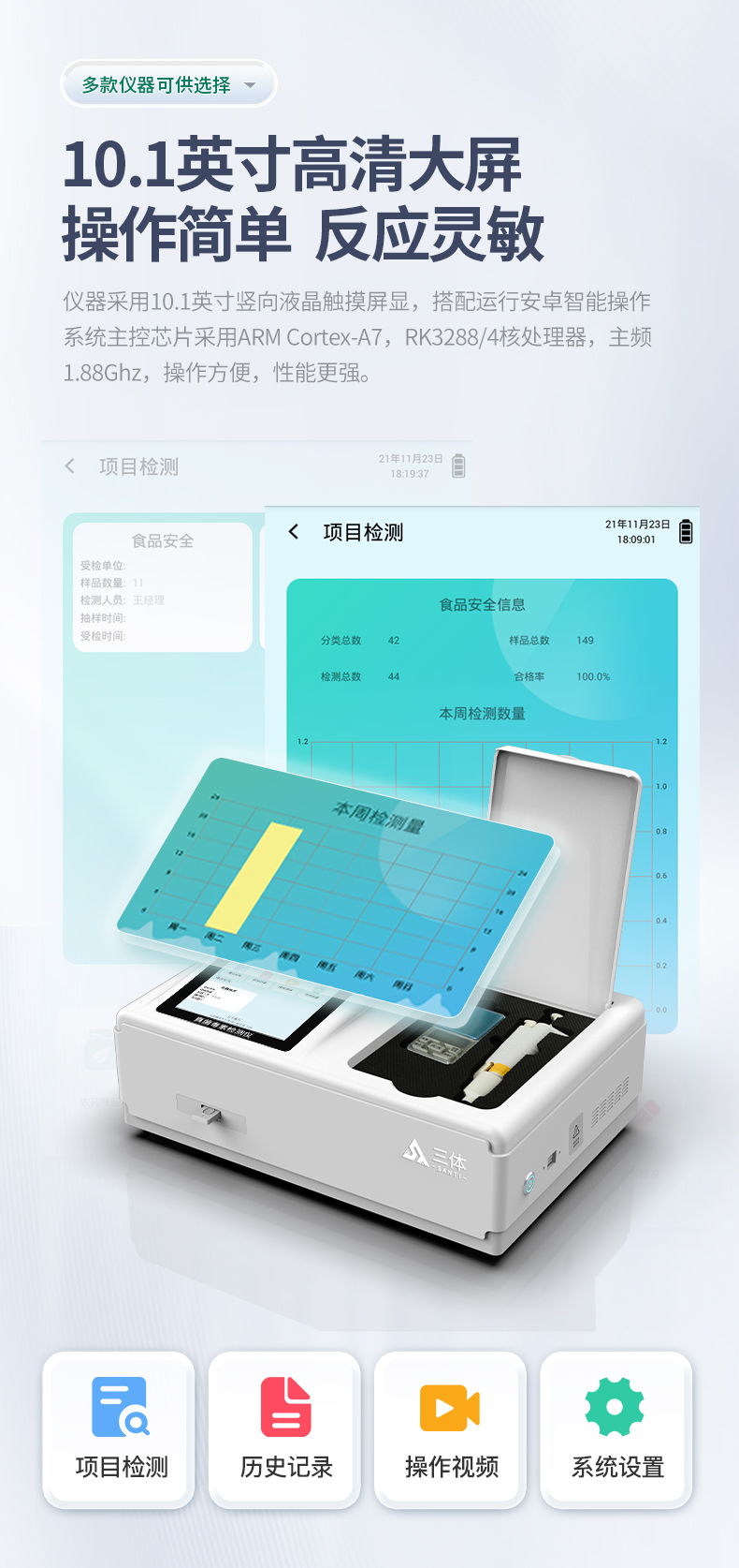 1、儀器采用10.1英寸液晶觸摸屏顯,搭配運(yùn)行安卓智能操作系統(tǒng),主控芯片采用ARM Cortex-A7,RK3288/4核處理器,主頻1.88Ghz,運(yùn)轉(zhuǎn)速度更快速,性能更強(qiáng)。