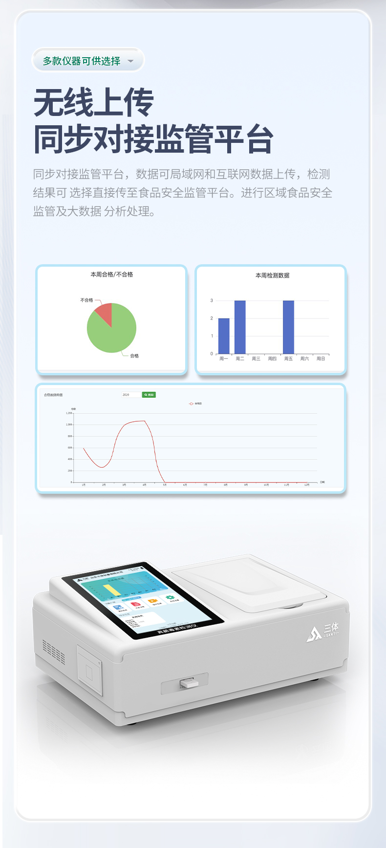 11、儀器具有 wifi 聯(lián)網(wǎng)上傳、RJ45網(wǎng)線連接功能,可以快速上傳數(shù)據(jù)。同步對(duì)接監(jiān)管平臺(tái),數(shù)據(jù)可局域網(wǎng)和互聯(lián)網(wǎng)數(shù)據(jù)上傳,檢測(cè)結(jié)果直接傳至食品安全監(jiān)管平臺(tái)。進(jìn)行區(qū)域食品安全監(jiān)管及大數(shù)據(jù)分析處理與數(shù)據(jù)統(tǒng)計(jì),檢測(cè)區(qū)域食品安全長(zhǎng)短期動(dòng)態(tài),達(dá)到食品安全問(wèn)題預(yù)估、預(yù)警。