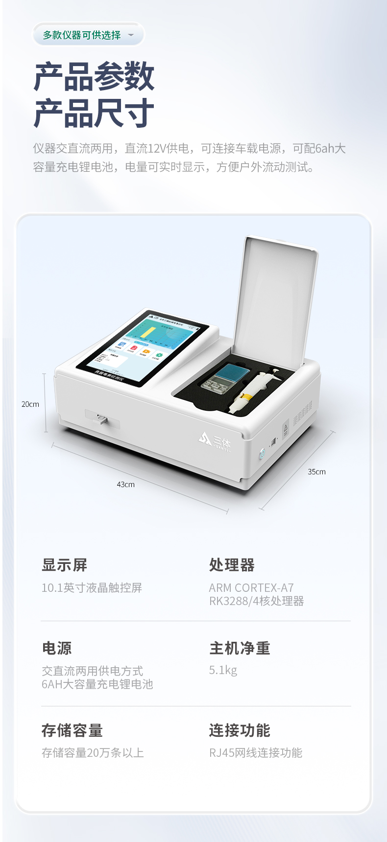 3.一體化臺(tái)式快檢設(shè)備,采用交直流兩用供電方式,可連接車(chē)載電源,配備6ah大容量充電鋰電池,可以滿足現(xiàn)場(chǎng)及流動(dòng)檢測(cè)使用的需求。儀器尺寸:43×35×20cm, 主機(jī)凈重:5.1kg