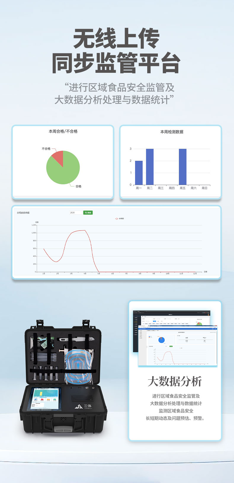 11、儀器具有 wifi 聯(lián)網(wǎng)上傳、RJ45網(wǎng)線連接功能,可以快速上傳數(shù)據(jù)。同步對接監(jiān)管平臺,數(shù)據(jù)可局域網(wǎng)和互聯(lián)網(wǎng)數(shù)據(jù)上傳,檢測結(jié)果直接傳至食品安全監(jiān)管平臺。進(jìn)行區(qū)域食品安全監(jiān)管及大數(shù)據(jù)分析處理與數(shù)據(jù)統(tǒng)計(jì),檢測區(qū)域食品安全長短期動(dòng)態(tài),達(dá)到食品安全問題預(yù)估、預(yù)警。