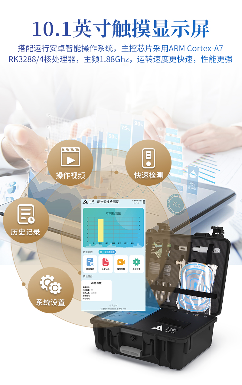 1、儀器采用10.1英寸液晶觸摸屏顯,搭配運行安卓智能操作系統(tǒng),主控芯片采用ARM Cortex-A7,RK3288/4核處理器,主頻1.88Ghz,運轉速度更快速,性能更強。