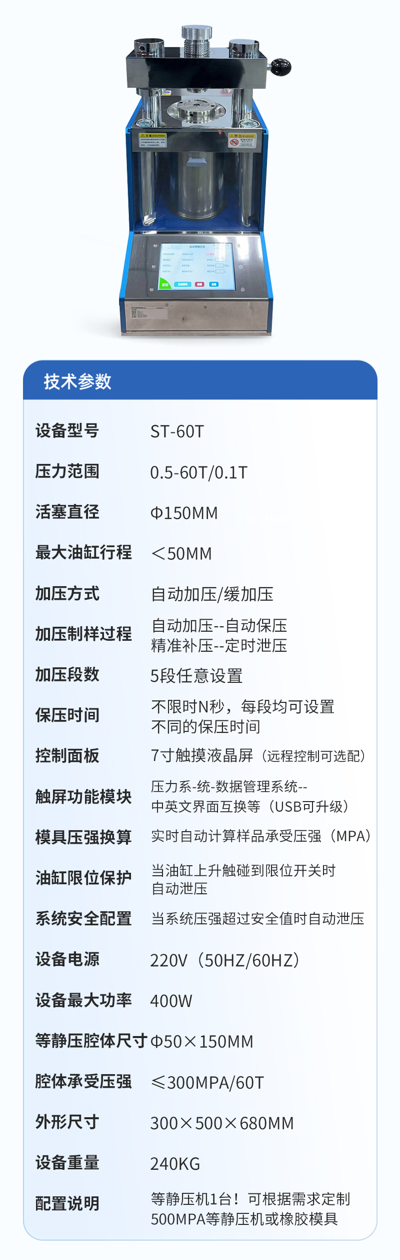 | 配置說明 | 等靜壓機(jī)1臺(tái)!可根據(jù)需求定制500MPa等靜壓機(jī)或橡膠模具 |